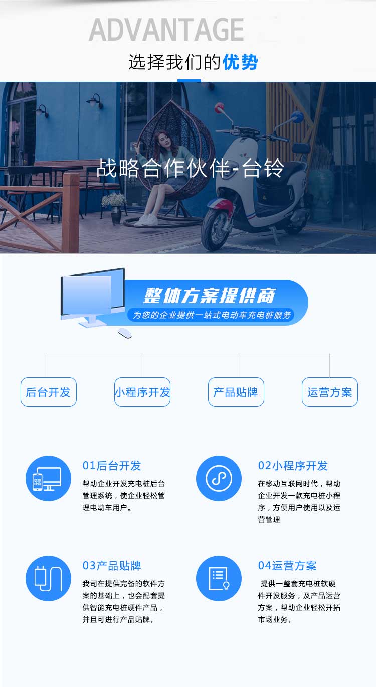 動(dòng)車、智能充電樁、智能充電柜、電動(dòng)車銷售與售后平臺(tái),致力于打造一套完整的電動(dòng)車生態(tài)圈,為客戶提供電動(dòng)車從購(gòu)買到使用、充換電及售后乖全方位的產(chǎn)品體驗(yàn)。